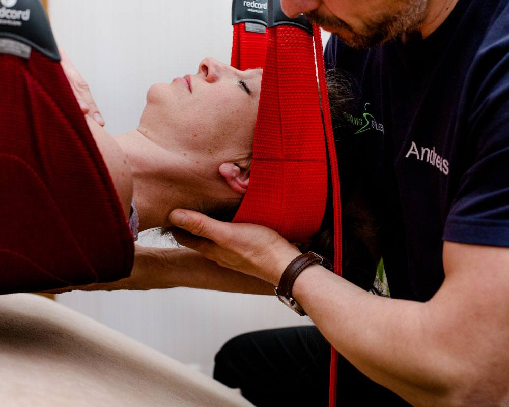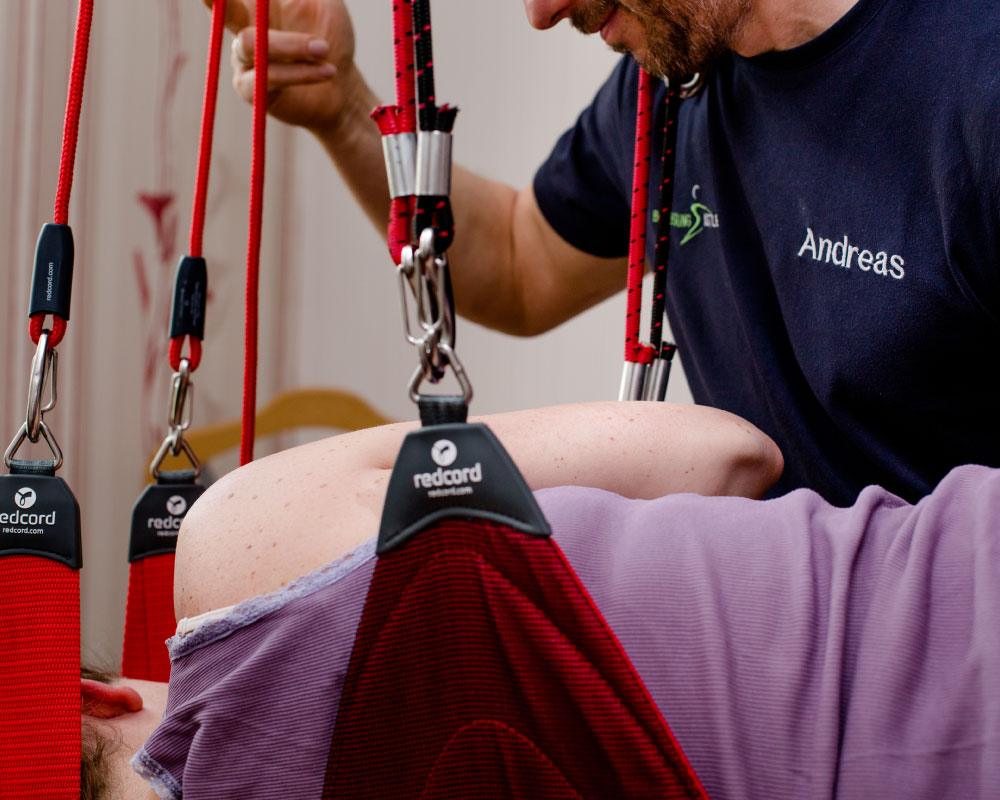 Die Behandlung erfolgt in einem speziellen Schlingengerät, das von der Redcord Clinic Oslo auf der Basis von klinischen und wissenschaftlichen Erkenntnissen entwickelt wurde.